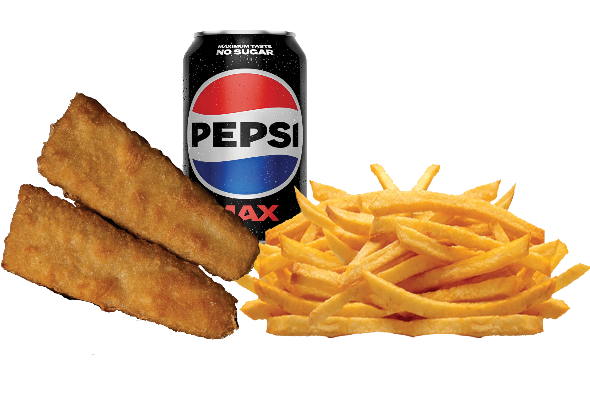 2 stk fish`n chips, pommes & 0,33 l sodavand