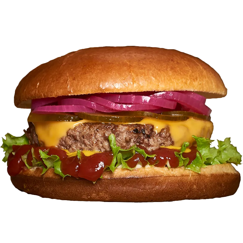 150 g bøf, mayo, salat, hjemmesyltede rødløg, agurkesalat, ost, ketchup, amerikansk sennep.