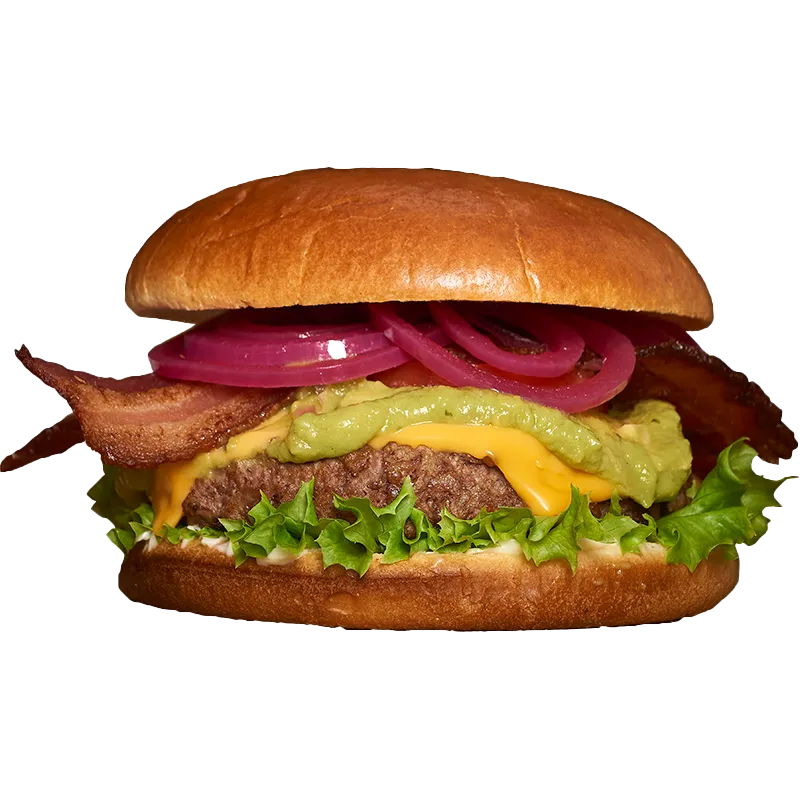 150 g bøf, mayo, salat, hjemmesyltede rødløg, tomat, bacon, ost, guacamole.