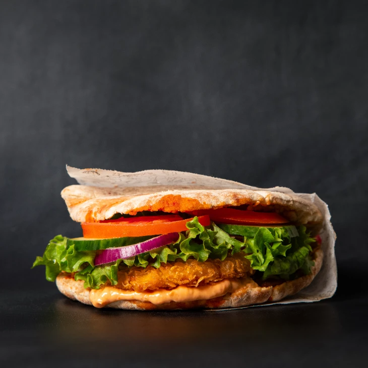 Crispy chicken er tilberedt med frisk icebergsalat, tomat, agurk, rødløg og med burger dressing.