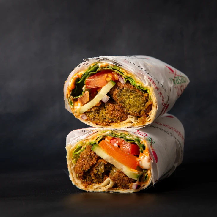 Falafel er tilberedt med frisk icebergsalat, tomat, agurk, rødløg og creme fraiche dressing.