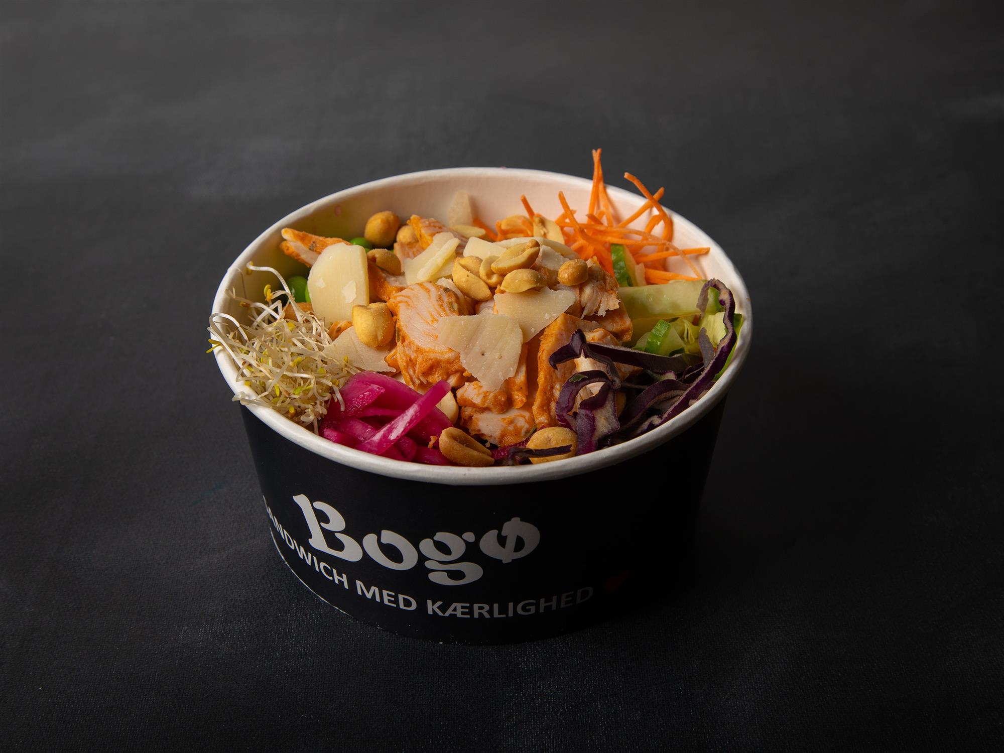 Hjemmesyltede rødløg, edamame bønner, revet frisk rødkål, lucernespire, revet agurk, revet gulerødder, peanuts, parmesan, pasta, iceberg, årstidens salat