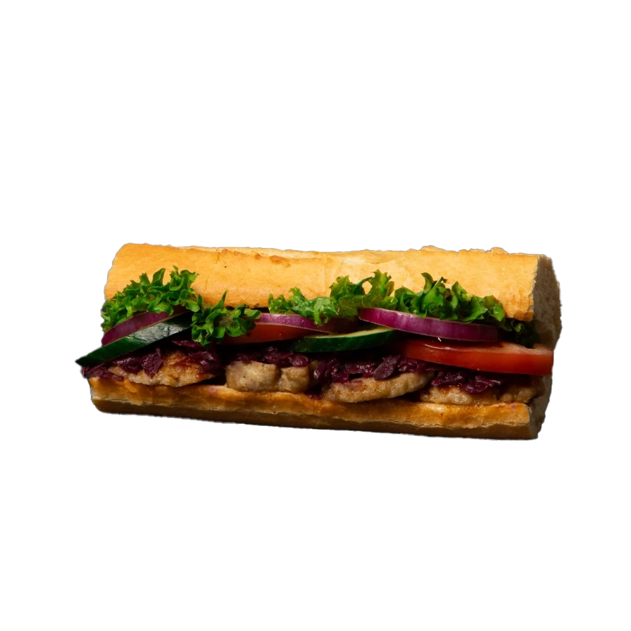 Frikadelle, rødkål, frisk icebergsalat, mayonnaise, tomat, agurk, rødløg, krydderiblanding