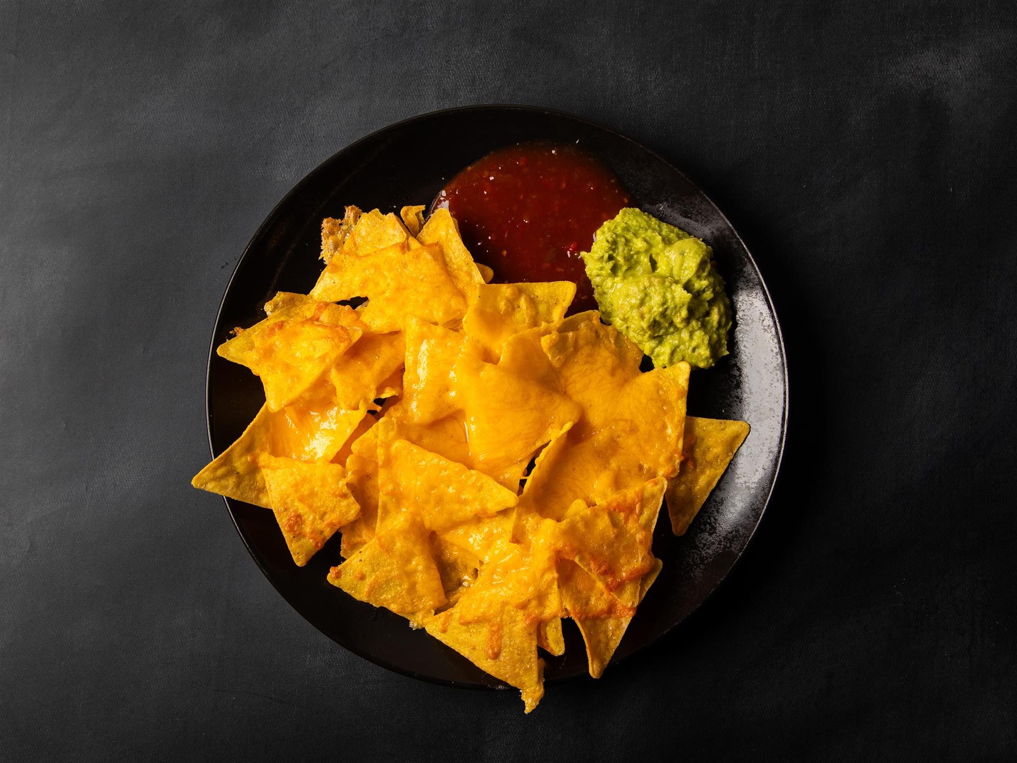 Sprøde tortillachips med smeltet ost, guacamole og salsa